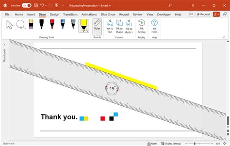 Web precisely control the angle of ruler in microsoft ppt, draw parallel lines in microsoft ppt If you want to hide the vertical ruler, go to file >. Or you can press alt + shift + f9 on your keyboard. One displays horizontally at the top of the active slide, and the other displays vertically along the left edge of the slide (shown below). This will enable the ruler in the left and top of. Web precisely control the angle of ruler in microsoft ppt, draw parallel lines in microsoft ppt Web accessing the ruler in microsoft powerpoint is easy. Click on the view tab, and check to turn the ruler on. The ruler pivots to any position you want: To enable the ruler, simply select view and then ruler from the top menu. Web you can use the ruler on the draw tab of the ribbon to draw straight lines or to align a set of objects.