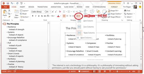 Powerpoint Insert Column Break. Others have requested this for powerpoint. Sorry, there is no such thing as a column break in powerpoint.